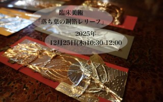 こんにちは、アートナビゲーター&臨床美術士 大西宏美です 【季節を感じる、心ほぐれる時間】 「臨床美術」を体験する会 12月は 「落ち葉の銅箔レリーフ」 美術の専門教育を受けていない私が(建築出身です)アートの世界に。え!?これどうやって作ったの!?と驚いたプログラムです。フ」 ― クリスマス ― 静かに灯る光に、 心 [...]